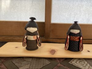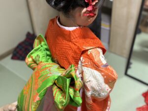 母の着物でグリーンと赤い帯、少しだけ、クリスマス気分を表しました。