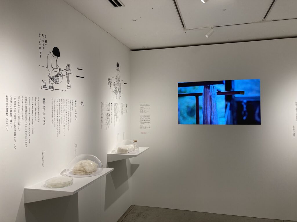 映像での繭からの真綿、糸への紡ぎ、染め、細かい絵柄の機織。